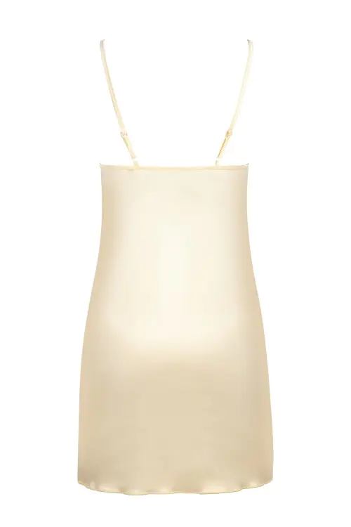 Połyskujący materiał w odcieniu szampana, z którego wykonano halkę dodaje niezwykłego szyku i podkreśli walory każdego typu urody. Bogato zdobiony dekolt w bordowe róże z ozdobnym wiązaniem, stanowią piękną dekorację górnej części halki. Zdobienie sprawia, że bielizna nocna zyskuje na ekskluzywności i przyciąga wzrok.