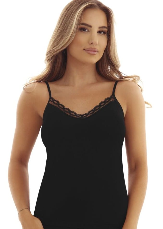 Koszulka na cienkim ramiączku z wiskozy. Miękka i delikatna, idealnie dopasowuje się do ciała, zapewnia komfort noszenia. Dekolt ozdobiony efektowną gipiurą. Skład: 92% wiskoza, 8% elastan.
