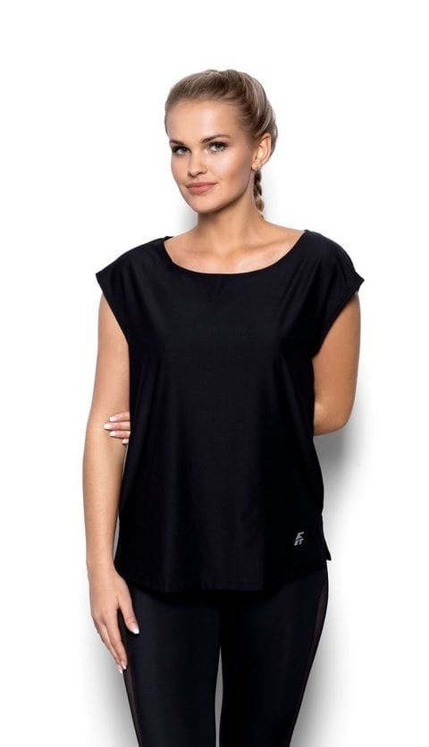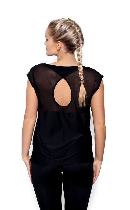 Stylowa bluzka z kolekcji Fit by Eldar - zupełnie gładka z przodu, zaś na plecach w sporej części zdobiona siateczkowym tiulem z efektem prześwitu. Krótkie rękawy, ładny, migdałowy dekolt i luźny fason sprzyjać będą Twojej wygodzie. Skład: 86% poliester, 14% elastan.