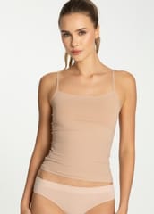 Gładka koszulka na cienkich, regulowanych ramiączkach z dekoltem. Uszyta z elastycznej dzianiny i wykończona w technologii płaskich krawędzi. Pasuje solo, pod bluzkę lub z marynarką. Skład: 90% poliamid, 10% elastan.