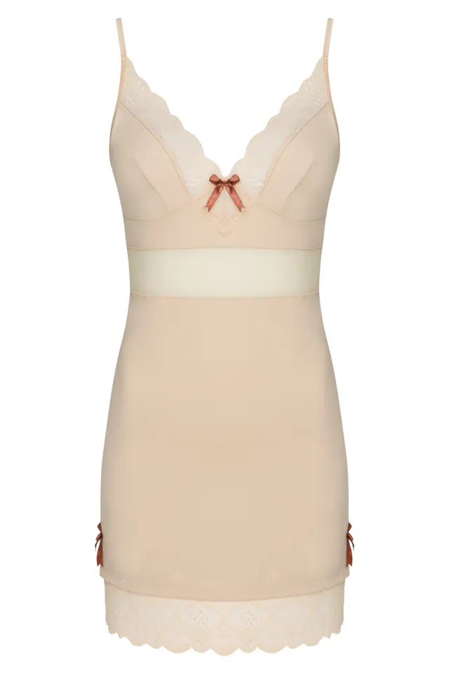 Elegancka koszulka nocna w jasnym kolorze, ozdobiona śliczną koronką. Bardzo kobiecy fason, zaakcentowany kokardkami, od razu zwraca na siebie uwagę. Tkanina elastyczna, świetnie poddaje się ruchom ciała. Miseczki miękkie, typu soft. Regulowana długość ramiączek. Stringi gratis. Skład: 90% poliamid, 10% elastan.