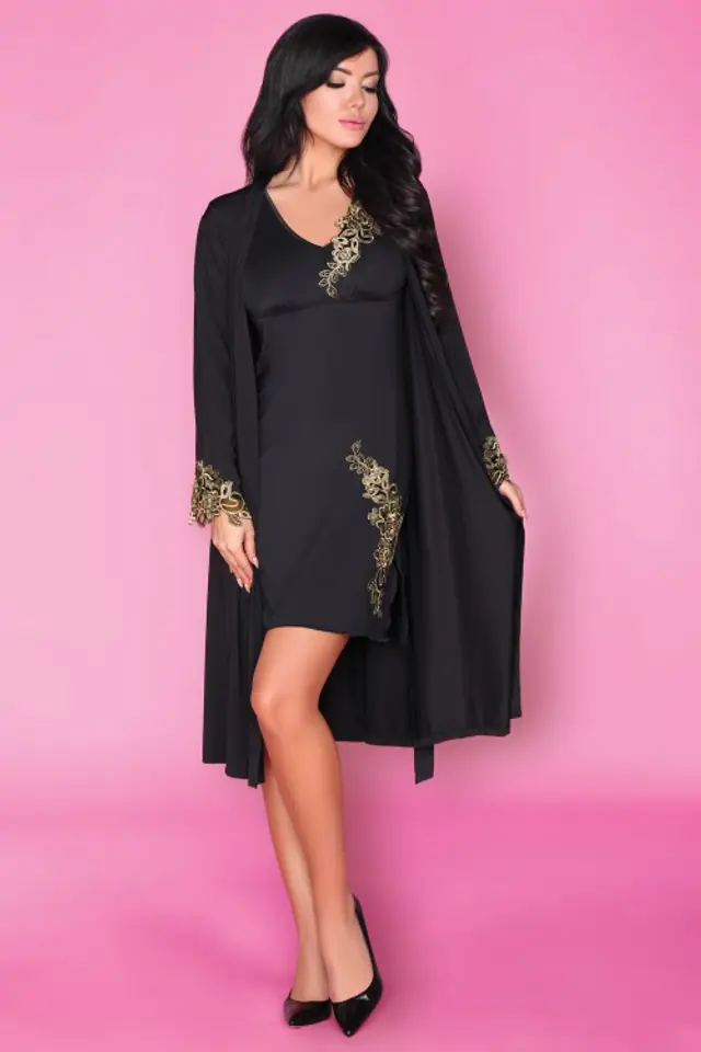 Niezwykle kobieca z krótkim rękawem koszulka, odcinana pod biustem, z elastycznego materiału w kolorze czerni. Głęboki dekolt w serek ozdobiony dekoracyjnym, złotym haftem. Dodatkowo złota aplikacja na jednym udzie.