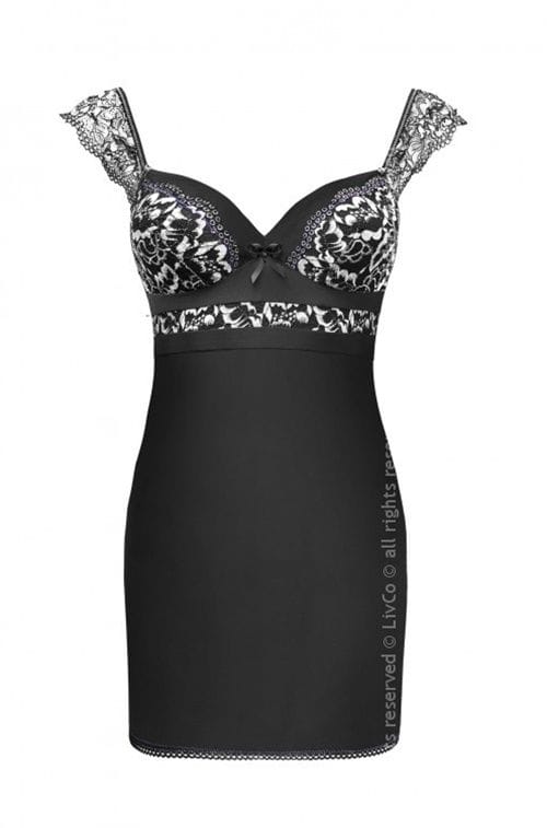 Czarna, dopasowana do ciała koszulka nocna zdobiona jasną, kwiecistą koronką. Inspirowana sukniami wieczorowymi - ma śliczne, koronkowe ramiączka, profilowane miseczki i zmysłowy dekolt. W komplecie stringi gratis. Skład: 90% poliamid, 10% elastan.