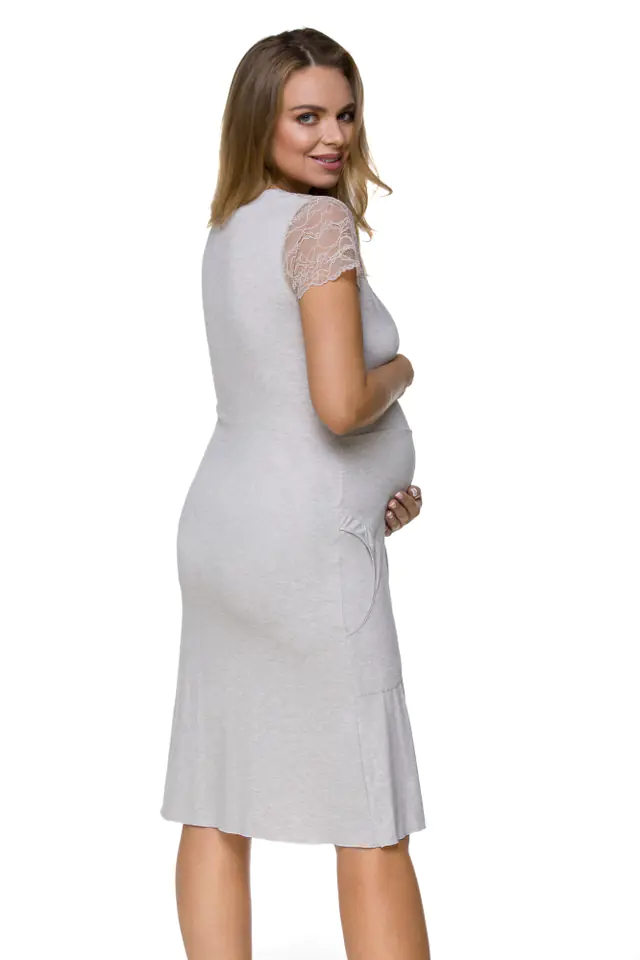 Koszula ciążowa i do karmienia piersią. Model z krótkim rękawem, długość do kolana, dekolt zapinany na napy. Góra koszulki wykonana z delikatnej koronki. Dodatkową cechą funkcjonalną są kieszenie po bokach koszulki. Model idealny do szpitala i nie tylko.