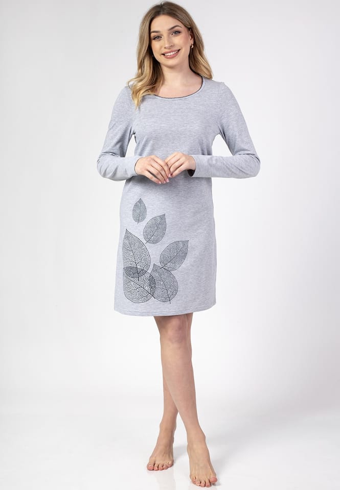 Koszula damska wykonana z wysokiej jakości bawełny. Dekolt półokrągły, przód ozdobiony nadrukiem w liście, długi rękaw. Długość przed kolano. Skład: 100% bawełna.