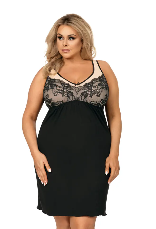 Nowość! Elegancka, zmysłowa i bardzo kobieca koszulka nocna renomowanej marki Donna, dostępna w większych rozmiarach. Wykonana z wysokiej jakości, elastycznej tkaniny, idealnie połączonej z czarną koronką. Krój, który sprosta większym biustom, ładnie podkreślając linię dekoltu i ramion. Pod biustem dodatkowo wszyta gumka, aby krój ładnie się układał. Szersze, komfortowe ramiączka. Model Sarah Plus, kolekcja 2020. Produkt pakowany w pudełeczko ze zdjęciem produktu, z bibułką w środku, idealne również na prezent. Skład: 90% wiskoza, 5% elastan, 5% poliamid.