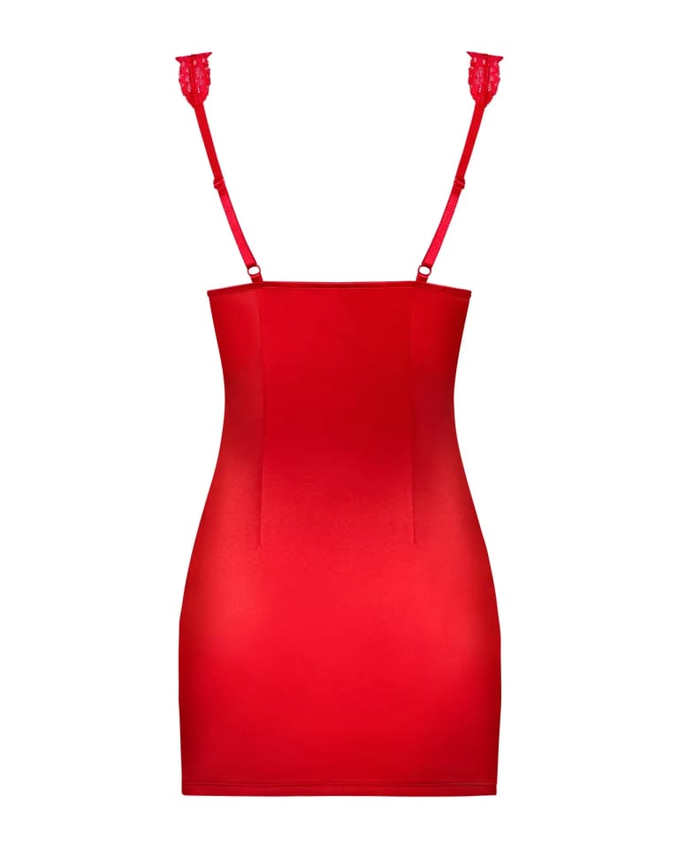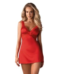 Czerwona koszulka nocna wykonana z elastycznej tkaniny o delikatnym błysku. Satynowa, przyjemna w dotyku, z koronkowymi wstawkami wokół miseczek. Dekolt z kokardką, ramiączka o regulowanej długości. Stringi w komplecie. Skład: 100% poliester.