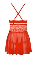 Sexy koszulka w stylu Babydoll. Czerwona, uwodzicielska, z pięknie zaprojektowaną górą. Miski miękkie, zdobione modnymi paskami - gumkami i cyrkonią - zjawiskowo podkreślają wygląd biustu i dekoltu. Koronka od razu uwodzi zmysły i dodaje delikatności. Luźny, zwiewny dół zapewni Ci najwyższą wygodę. Stringi w komplecie. Skład: 90% poliamid, 10% elastan.