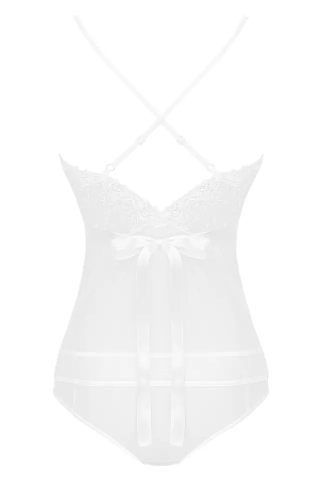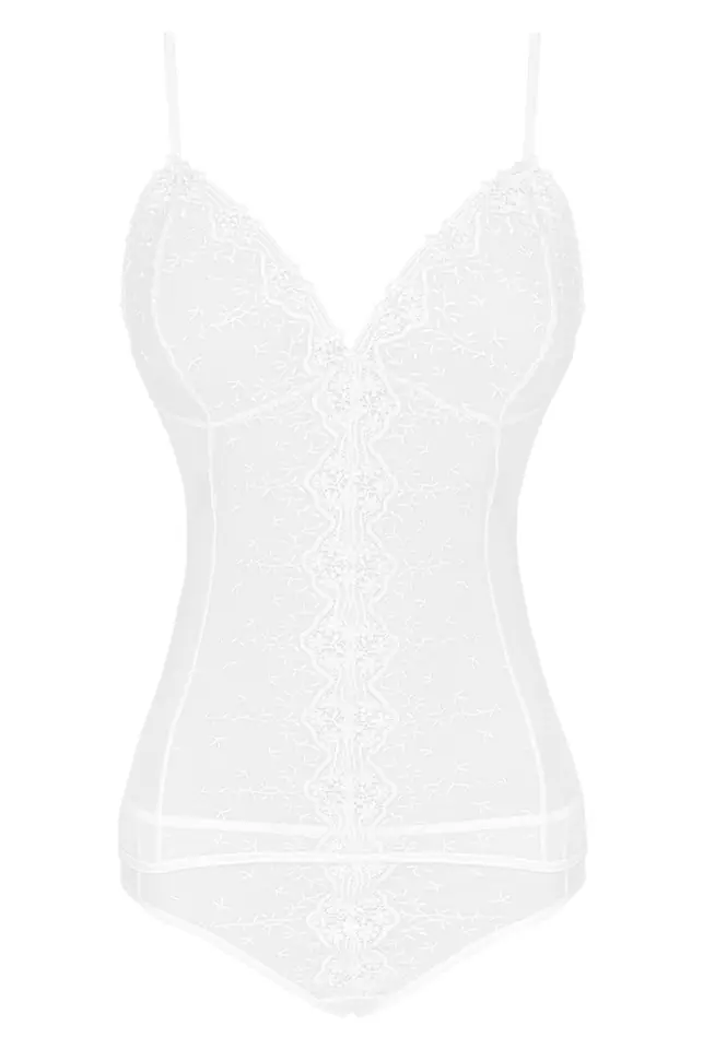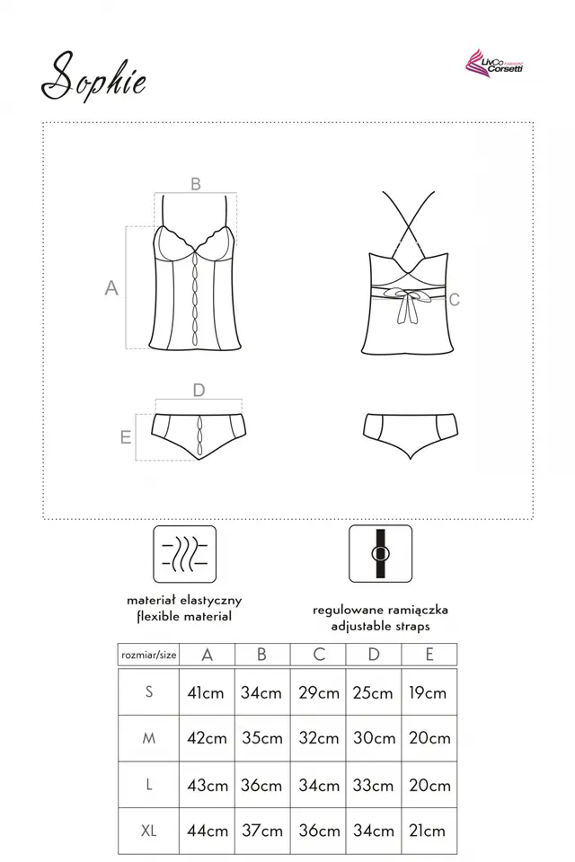 Romantyczna Sophie wykonana z delikatnego, śnieżnobiałego tiulu i misternej koronki z urzekającym motywem kwiatowym. Oryginalnym akcentem zmysłowej koszulki dla pań lubiących czuć się atrakcyjnie jest kokieteryjna, satynowa tasiemka wiązana z tyłu. W zestawie szorty idealnie pasujące do całości.