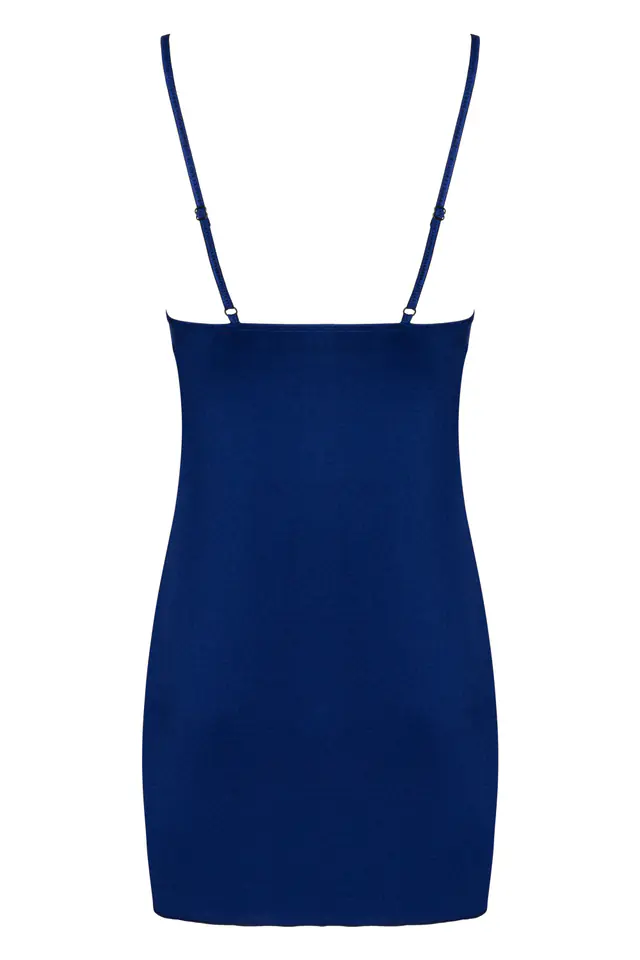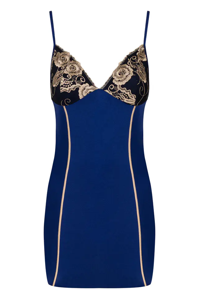 Zachwycająca koszulka z miękkiego materiału w kolorze granatu, łączonego ze złotym, kwiatowym haftem na czarnych miseczkach. Od biustu zdobienia aż do dołu - wąskie, symetryczne paski w kolorze haftu. Ramiączka z możliwością regulacji, w komplecie stringi.