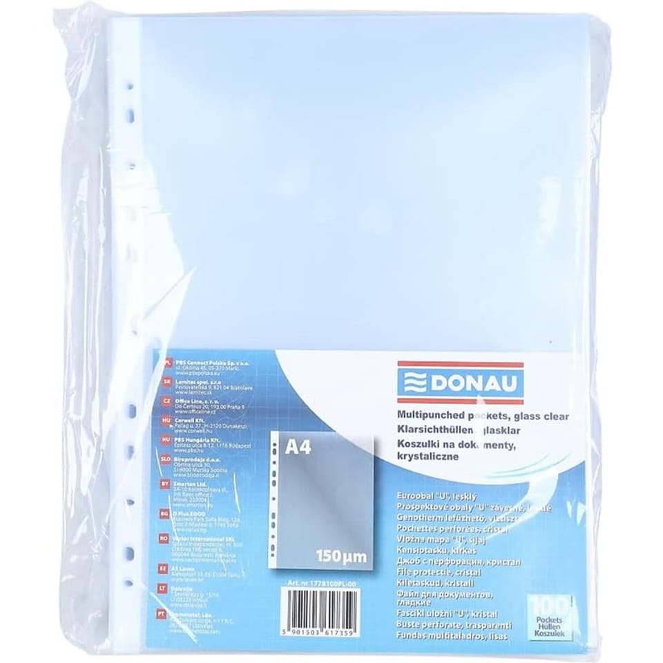 * koszulki Donau 150 ?m * krystaliczne, przezroczyste * otwarte na górze * przeznaczone na dokumenty w formacie A4 * ilość dziurek do wpięcia: 11 * 100 sztuk w j.s. * kolor transparentny