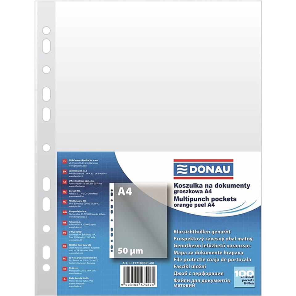 * koszulki wykonane z miękkiej, ekologicznej folii polipropylenowej (50?m), specjalnie wzmocniony brzeg * groszkowe, przeźroczyste * otwarte na górze * antyelektrostatyczne, antyrefleksyjne * przeznaczone na dokumenty w formacie A4 * ilość dziurek do wpięcia: 11 * rozmiar: 230x300mm * 100 sztuk w j.s. * kolor przeźroczysty
