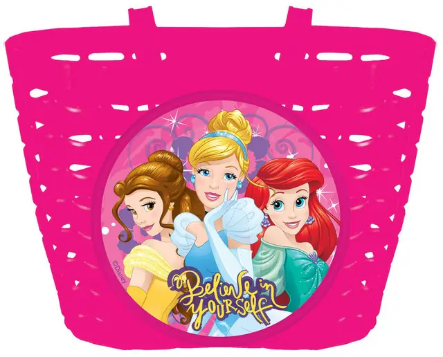 Koszyczek na kierownicę jest wykonany z kolorowego tworzywa sztucznego i ozdobiony naklejką z ulubionymi postaciami z bajek Disney. W bardzo prosty sposób mocuje się go do kierownicy za pomocą pasków załączonych w komplecie.