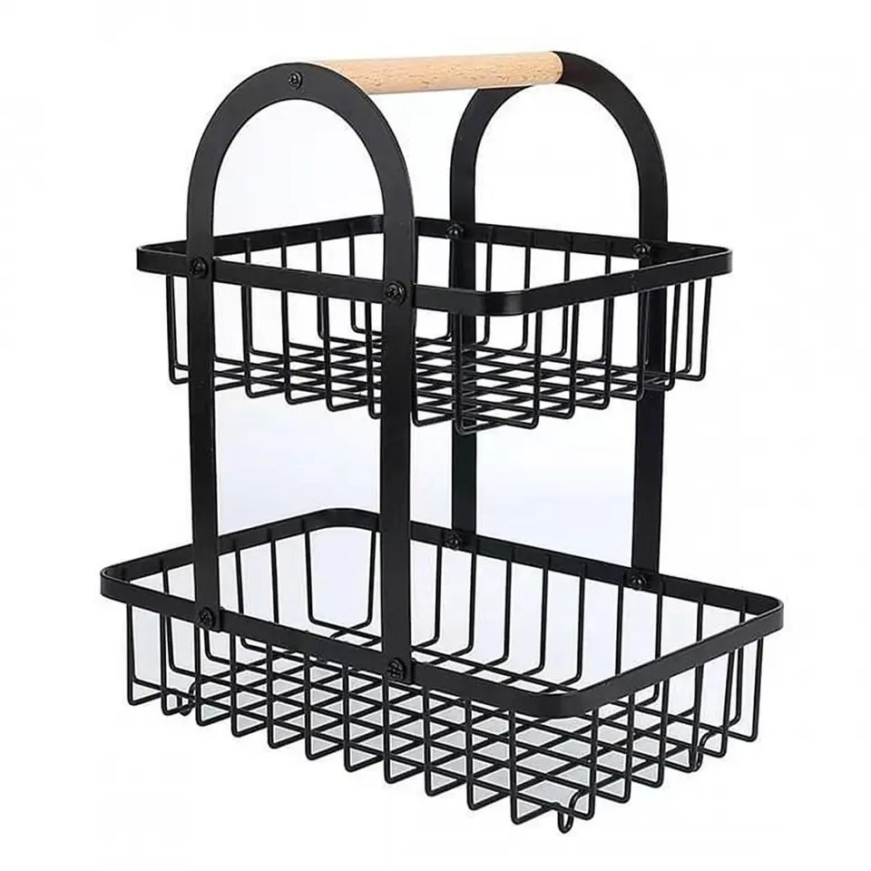 Koszyk piętrowy na owoce wykonany z prętów stalowych malowanych proszkowo. Może posłużyć do przechowywania owoców lub warzyw. Koszyk fantastycznie prezentuje się zarówno na kuchennym blacie jak i na eleganckim stole. Idealnie komponuje się z wnętrzami urządzonymi w stylu loft. Drewniana rączka do przenoszenia.