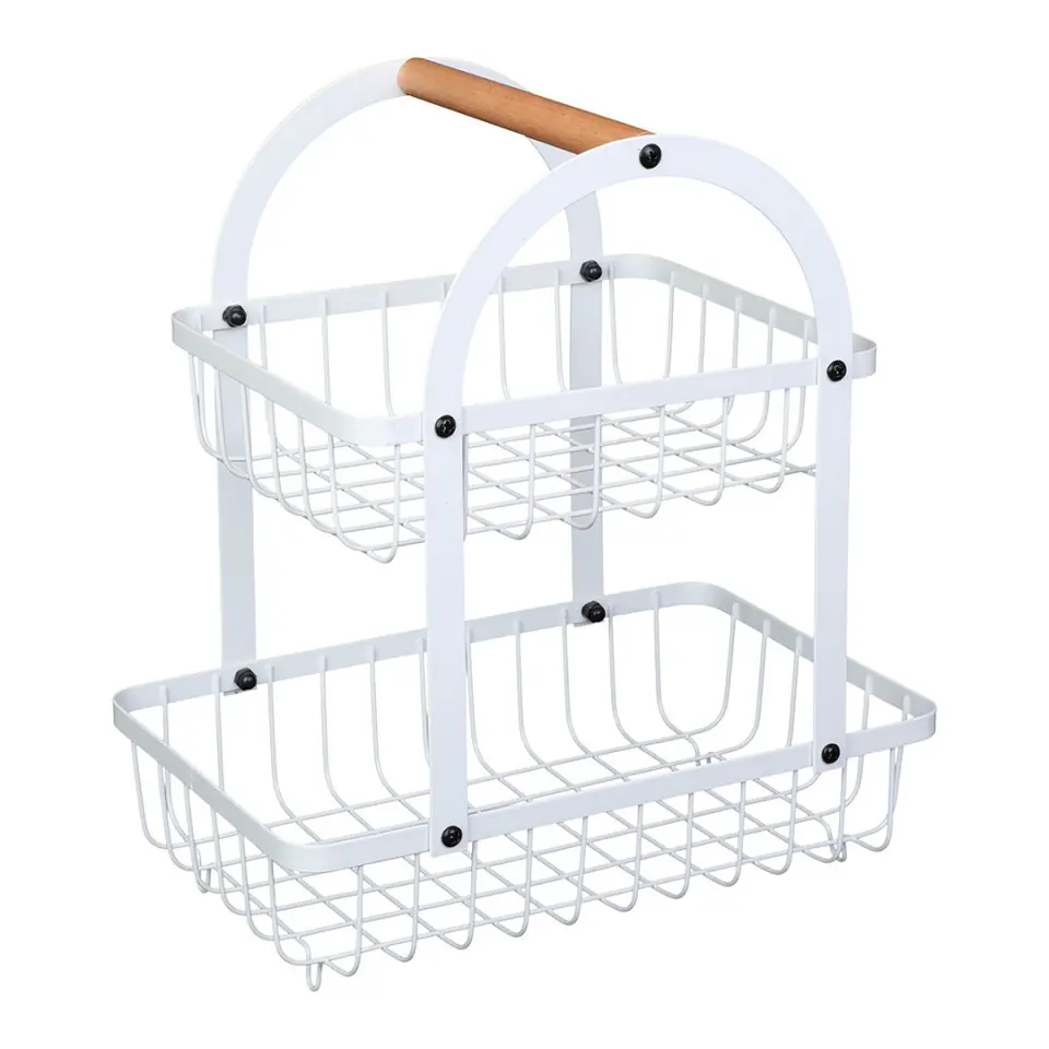 Koszyk piętrowy na owoce wykonany z prętów stalowych malowanych proszkowo. Może posłużyć do przechowywania owoców lub warzyw. Koszyk fantastycznie prezentuje się zarówno na kuchennym blacie jak i na eleganckim stole. Idealnie komponuje się z wnętrzami urządzonymi w stylu loft. Drewniana rączka do przenoszenia.