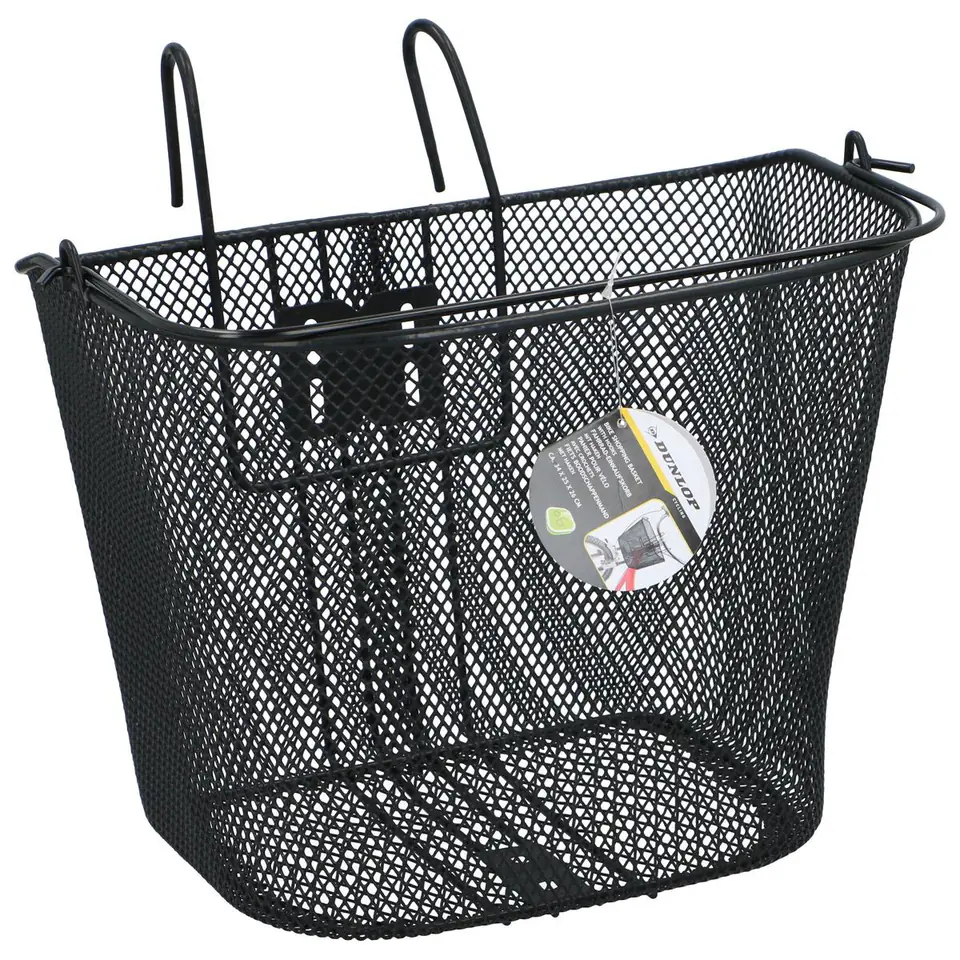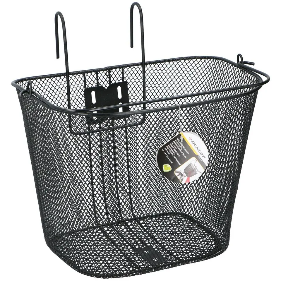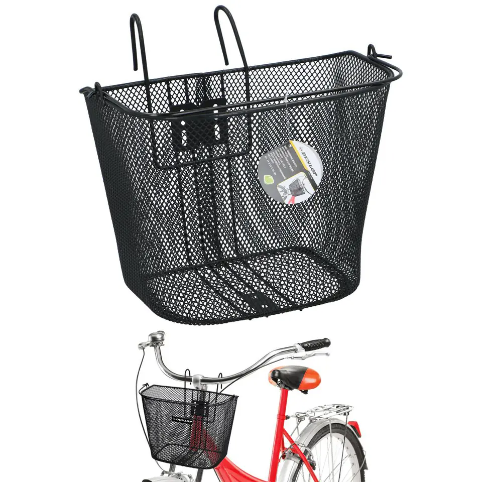 KOSZYK ROWEROWY DUNLOP NA PRZÓD NA HAKI wykonano ze stali malowanej proszkowo, ma pojemność około 20 l, charakteryzuje się dużą wytrzymałością oraz odpornością na odkształcenia, liczne drobne oczka w siatce zadbają o to, by drobne przedmioty nie wypadły w czasie jazdy.