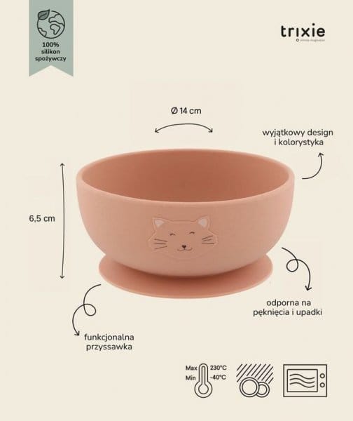 Silikonowa miseczka z wesołym zwierzakiem to doskonały sposób na wygodne karmienie malucha. Przyssawka zapewnia stabilność miseczki, eliminując ryzyko przewrócenia, zrzucenia i zabrudzeń. Miseczka wykonana jest z wytrzymałego, 100% silikonu spożywczego, który jest miękki w dotyku, nie pęka po upuszczeniu i nadaje się do użytku w kuchence mikrofalowej, piekarniku, zamrażarce i zmywarce.Cechy: - wyjątkowy design- funkcja przyssawki - miękka w dotyku - odporna na upadki i pękanie- podgrzewanie w mikrofalówce i piekarniku- myć w zmywarce- łatwa w czyszczeniu Materiał:100% silikon spożywczy Zalecany wiek:4 miesiące+Wymiary:14 x 14 x 6.5 cm...