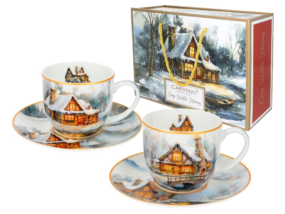 Filiżanki ozdobione są zimowymi dekoracjami oddającymi mroźną, zimową aurę. Z okien bije ciepłe, złociste światło, a z komina unosi się delikatny dym, sugerując, że w środku płonie przytulny kominek. Dasz się zaprosić?