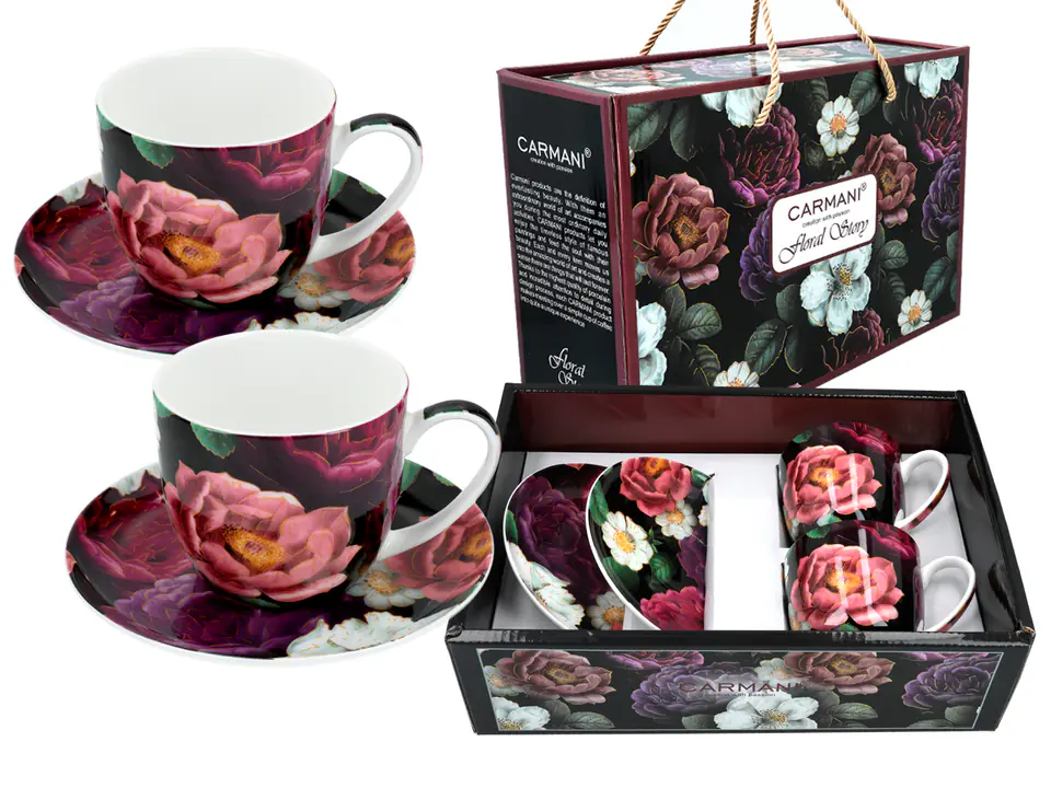 Zestaw dwóch filiżanek ze spodkami ozdobionych efektowną kompozycją kwiatów na czarnym tle. Filiżanki zostały zapakowane w wysokiej jakości pudełko - kuferek, co dodatkowo zwiększa prestiż produktu.