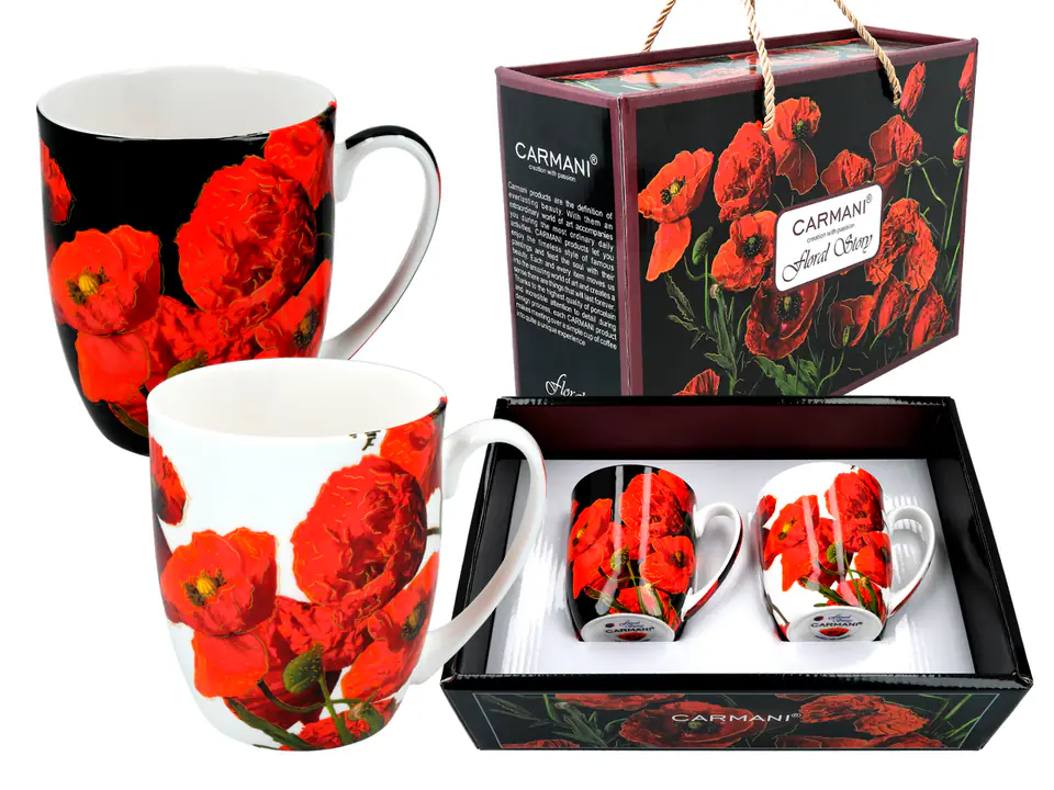 Zestaw dwóch eleganckich kubków ozdobionych makami polnymi ale każdy na innym tle. Kubki zostały zapakowane w wysokiej jakości pudełko - kuferek, co dodatkowo zwiększa prestiż produktu.