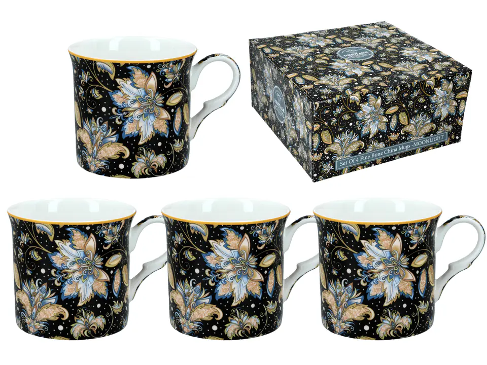 Zestaw czterech porcelanowych kubków o pojemności 295ml, każdy z unikalną kwiatową ilustracją. Kubki są trwałe, wygodne i idealne do codziennego użytku.