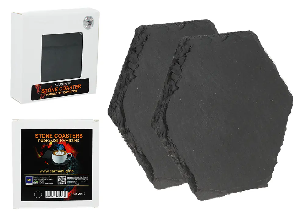 Zestaw 4 podkładek pod kubki z kamiennego łupka. Są zarówno użyteczne, jak i bardzo dekoracyjne. Charakteryzują się oryginalnymi, nieoszlifowanymi krawędziami.