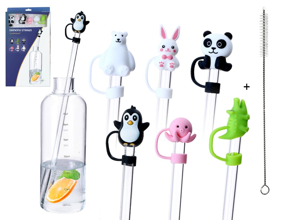 Kpl. 6 szklanych słomek z silikonowymi końcówkami i czyścikiem.