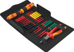 21-częściowy zestaw narzędzi do pracy bez napięcia i przy dopuszczalnym napięciu 1000 V. 1 rękojeść 837 i VDE z funkcją grzechotki, 1 rękojeści 817 VDE każda z rękojeści z uchwytem do trzpieni wymiennych VDE firmy Wera 14 trzpieni wymiennych VDE (każdy o długości 157 mm) ze zredukowaną średnicą trzpienia (Kraftform Kompakt 60 i Take it easy 0,4x2,5 i Kraftform Kompakt 67 i Take it easy TX 10 ze standardową średnicą), zapewniających dostęp do głęboko położonych połączeń śrubowych i elementów sprężynowych System wyszukiwania narzędzi Take it easy: oznaczenie kolorystyczne według profilu i laserowe oznaczenie rozmiaru ułatwiające i przyspieszające odnajdywanie właściwego narzędzia.