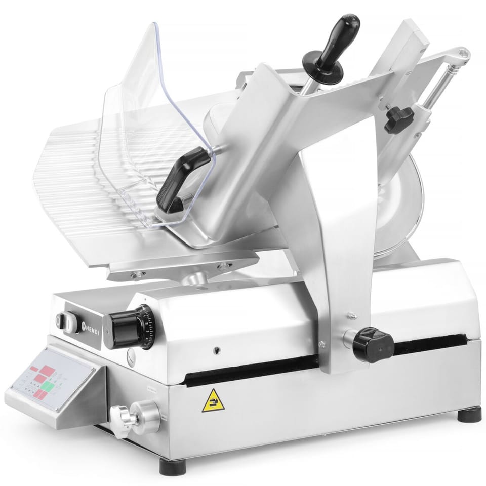 Kod producenta: 210949Krajalnica automatyczna 350 firmy HENDI to włoskie urządzenie typu heavy-duty, które wyróżnia się dużą mocą silnika 370W, zapewniającą możliwość krojenia twardych kiełbas, serów, wędlin oraz mięs i ryb (bez kości/ości). Regulacja grubości krojenia pozwala łatwo uzyskać pożądane rezultaty. Idealnie cienkie lub grubsze plastry bez względu na rodzaj produktu, czy to wędlina, czy to twardy ser. Dzięki wbudowanej ostrzałce urządzenie zawsze oferuje 100% wysokiej jakości krojenia. Krajalnica posiada możliwość zaprogramowania automatycznego krojenia produktów ze stałą lub ze zmienną prędkością wózka. Obudowa została wykonana z aluminium, a płyta robocza z tłoczonego arkusza aluminium. Możliwość demontażu stalowego holdera wykonanego ze stali nierdzewnej i umycia go w zmywarce pozwala na łatwe utrzymanie higieny. Urządzenie posiada silnik chłodzony powietrzem z zabezpieczeniem przed przegrzaniem. Krajalnica spełnia wszelkie wymogi bezpieczeństwa dla urządzeń do użytku profesjonalnego, tj.:- Ustawienie pokrętła na grubość krojenia „0#8221; utrzymuje ostrze za jego osłoną,- Ochrona przed uruchomieniem przy zdemontowanej ostrzałce lub zdjętej osłonie ostrza,- Możliwość zablokowania i zdemontowania wózka tylko przy ostrzu ustawionym w pozycji „0#8221; grubości,- Zabezpieczenie ostrza w postaci zamocowanego na stałe pierścienia.Cechy produktu: