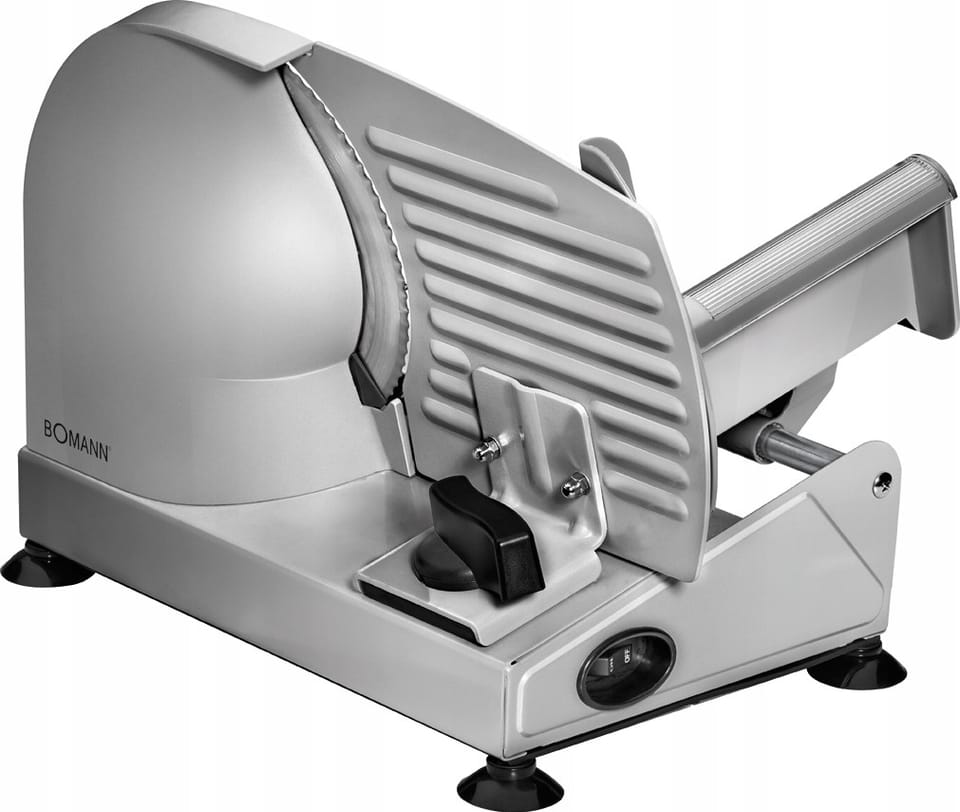 NAJWYŻSZEJ JAKOŚCIKRAJALNICA DO CHLEBA, WĘDLIN, SERARENOMOWANEJ FIRMY BOMANNMODEL: MA 451Równe pokrojenie sera, wędlin, czy chleba zawsze stanowi problem.Krajalnica pozwoli się go pozbyć.Krajalnica z nierdzewnym nożem ze stali szlachetnej i uniwersalnym szlifem falowym. Jest bardzo prosta w obsłudze, precyzyjnie pokroi pieczywo, wędliny, sery itp.ZAPOMNIJ O STARYCH PROBLEMACH!Domowa krajalnica to bardzo praktyczne urządzenie. Dzięki niemu możesz dokładnie kontrolować co jesz, kupując produkty w jednym kawałku. Tak przechowywane artykuły spożywcze dłużej są świeże i smaczne.Nie pozbawi cię to przyjemności płynącej ze smakowania cieniutkich plasterków szynki wędlin długo dojrzewających, salami czy wytrawnego sera. Krajalnica pokroi także pieczywo, duże warzywa i owoce na plastry. Samodzielnie wyregulujesz grubość plastrów, na jakie masz ochotę w granicach od 1 do 15 mm. Bezpieczny kciuk!Ważnym elementem, a być może jednym z ważniejszych w krajalnicy jest funkcja ochrony kciuka. Jest to element, który pomoże nam przytrzymać mniejsze kawałki produktów, bez narażania palców na kontakt z ostrzem krajalnicy. Doceni ją każdy, kto chociaż raz zmagał się z koniecznością pokrojenia małych kawałków pieczywa czy wędlin, których przytrzymywanie sprawia ogromne kłopoty.Warto zwrócić uwagę na sposób włączania. Nie musisz wciskać przycisku, który uruchamia maszynę tak długo jak go trzymasz. Tutaj masz dwie ręce wolne, ponieważ urządzenie zaczyna pracować po przestawieniu włącznika w pozycję ON, a wyłącza się po przestawieniu w pozycję OFF.Precyzję cięcia zapewnia wydajny silnik o mocy 150 W, napędzający w ruch duże obrotowe ostrze o średnicy 190 mm wykończone ząbkami. Ostrze wykonane jest z trwałej stali nierdzewnej - łatwo się ściąga i myje.Obudowa krajalnicy odlana jest z metalu - dzięki temu jest stabilna i trwała. Dodatkowo spód zabezpieczony jest przez gumowe przyssawki, utrudniające przesuwanie lub przypadkowe zrzucenie urządzenia. Najważniejsze cechy krajalnicy Bomann MA 451 CB Duży, nierdzewny nóż ze stali szlachetnej (O 190 mm)Uniwersalny szlif falowyOdlewana pod ciśnieniem, aluminiowa obudowa silnikaPłynnie ustawiana grubość krojenia (0–15 mm)Metalowa szyna prowadzącaStół pomocniczy ze stali nierdzewnej, odchylany dla łatwego czyszczeniaStalowa płyta dosuwającaSzyna na resztki z ochroną palcówPrzełącznik WŁ/WYŁ.Wysoka stabilność220-240 V, 50/60 Hz, 150 WWaga 4,2 kgslimtex
