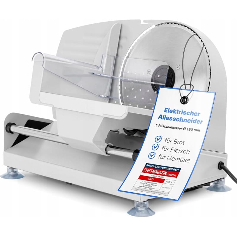 Krajalnica do Chleba Sera Szynki Stalowa 150W Domowa Wędlin ElektrycznaWysokiej jakości krajalnica elektryczna do chleba, wędlin, sera i warzyw.Zmień swoją kuchnię w profesjonalne stanowisko do krojenia! Z krajalnicą Clatronic każdy plasterek chleba, szynki czy sera będzie perfekcyjny – dokładnie taki, jak lubisz. Koniec z krzywymi kromkami i zgniecionymi wędlinami!Kluczowe cechy:Duży nóż ze stali nierdzewnej (O 190 mm): zapewnia precyzyjne i równomierne cięcie różnorodnych produktów spożywczych.Bezstopniowa regulacja grubości krojenia (0–15 mm): umożliwia dostosowanie grubości plastra do indywidualnych preferencji.Solidna aluminiowa obudowa: odlewana pod ciśnieniem, gwarantuje trwałość i stabilność urządzenia podczas pracy.e-katalog.plMetalowa szyna prowadząca i stalowa płyta dosuwająca: zapewniają precyzyjne prowadzenie krojonego produktu.Odchylany stół pomocniczy ze stali nierdzewnej: ułatwia czyszczenie i konserwację urządzenia.Antypoślizgowe gumowe nóżki: zwiększają bezpieczeństwo użytkowania, zapobiegając przesuwaniu się krajalnicy podczas pracy.Moc 150 W: zapewnia efektywne działanie urządzenia przy codziennym użytkowaniu.Wymiary i waga: 365 × 235 × 265 mm; waga około 4,2 kg Dlaczego warto Precyzja bez kompromisów – regulowana grubość krojenia (od 0 do 15 mm) pozwoli Ci idealnie dopasować każdy plasterek. Wytrzymałość na lata – solidna, metalowa obudowa i nóż ze stali nierdzewnej gwarantują trwałość i niezawodność nawet przy intensywnym użytkowaniu. Bezpieczeństwo i komfort – antypoślizgowe nóżki, osłona na palce i łatwe czyszczenie sprawiają, że obsługa krajalnicy to czysta przyjemność. Wielozadaniowość – doskonała nie tylko do pieczywa, ale też wędlin, serów, warzyw czy owoców. Idealna do każdej kuchni:Nie musisz być szefem kuchni, by korzystać z profesjonalnych narzędzi. Krajalnica Bomann to połączenie stylu, mocy i precyzji w Twoim domu. Precyzję cięcia zapewnia wydajny silnik o mocy 150 W, napędzający w ruch duże obrotowe ostrze o średnicy 190 mm wykończone ząbkami. Ostrze wykonane jest z trwałej stali nierdzewnej - niezwykle łatwe w demontażu i utrzymaniu w czystości.Obudowa krajalnicy wykonana jest z metalu - dzięki temu jest stabilna i trwała. Dodatkowo spód zabezpieczony jest przez gumowe przyssawki, utrudniające przesuwanie lub przypadkowe zrzucenie urządzenia. Moc: 150 WUniwersalny szlif falowyOdlewana pod ciśnieniem, aluminiowa obudowa silnikaPłynnie ustawiana grubość krojenia (0–15 mm)Metalowa szyna prowadzącaStół pomocniczy ze stali nierdzewnej, odchylany dla łatwego czyszczeniaStalowa płyta dosuwającaSzyna na resztki z ochroną palcówPrzełącznik WŁ/WYŁ.Wysoka stabilność dzięki gumowym nóżkom220-240 V~, 50/60 Hz