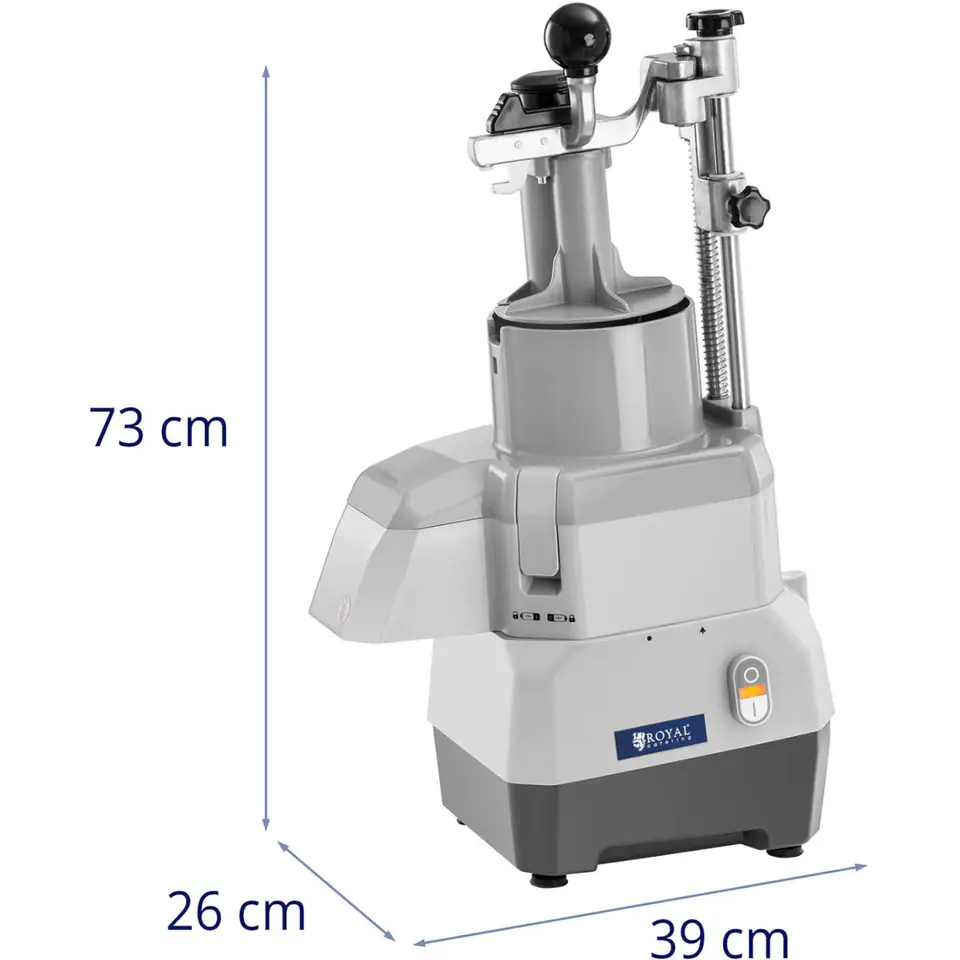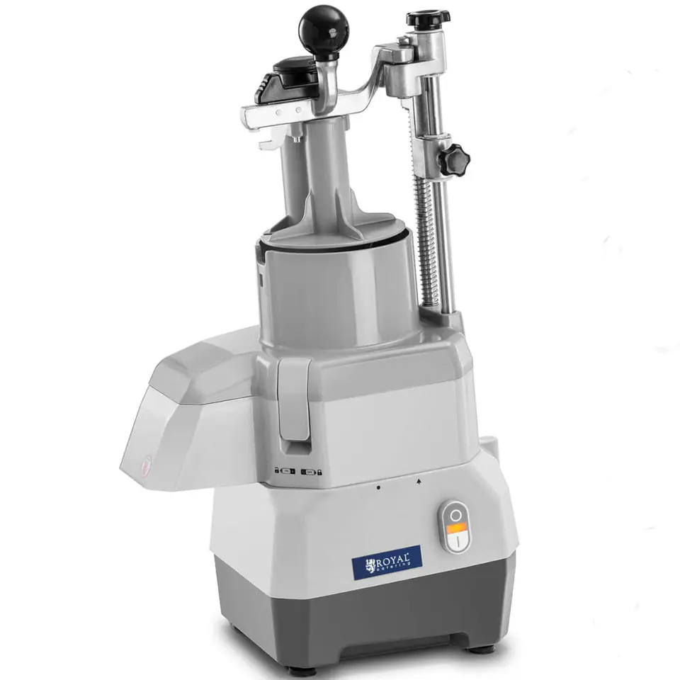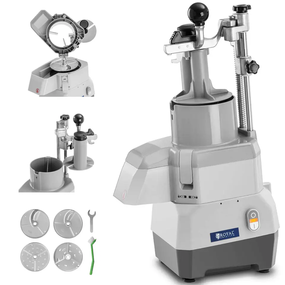 Krajalnica elektryczna do warzyw marki Royal Catering znacznie usprawni pracę w branży gastronomicznej, w restauracji, stołówce czy w barze z przekąskami. Szatkownica nadaje się do siekania marchwi, cebuli, selera ponadto umożliwia krojenie owoców, a nawet miękkiego sera. Maszyna posiada jeden przełącznik do włączania i wyłączania. Dzięki silnikowi o mocy 735 W ostre tarcze tnące obracają się z prędkością 1500 obr./min, a średnica 174 mm, pozwala na pokrojenie lub starcie dużej ilości owoców lub warzyw w krótkim czasie. Cztery gumowe nóżki zapewniają stabilność urządzenia i sprawiają, że nie wibruje on na stole roboczym. Maszyna posiada dwa otwór, jeden z boku do warzyw podłużnych oraz drugi do produktów o standardowym kształcie. Plastikowym popychaczem można docisnąć żywność, chroniąc dłonie przed ostrzami. Wylot został zaprojektowany tak, aby można było wygodnie umieścić pod nim miskę. Cztery tarcze dołączone do zestawu zostały wykonane ze stali nierdzewnej (3 i 7 mm do tarcia, 2 i 4 do krojenia). Przy wymianie tarcz krajalnica wyłącza się automatycznie.