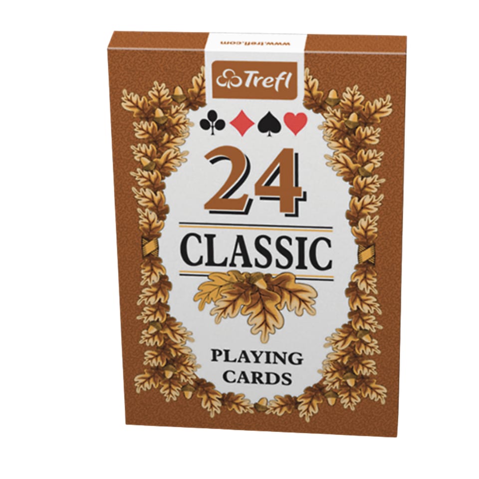 Classic - karty standardowe Karty Classic to wzór znany w Polsce od dziesięcioleci. Charakterystyczne bursztynowe rewersy ozdobione są liśćmi dębu, a figury i kolory oznaczone międzynarodowym wzorem. Talia dla graczy lubiących klasykę w tradycyjnym wydaniu. Talia zawiera 24 listki karciane od 9tek do asów Producentem kart są działające od 1947 roku Krakowskie Zakłady Wyrobów Papierniczych Trefl-Kraków.