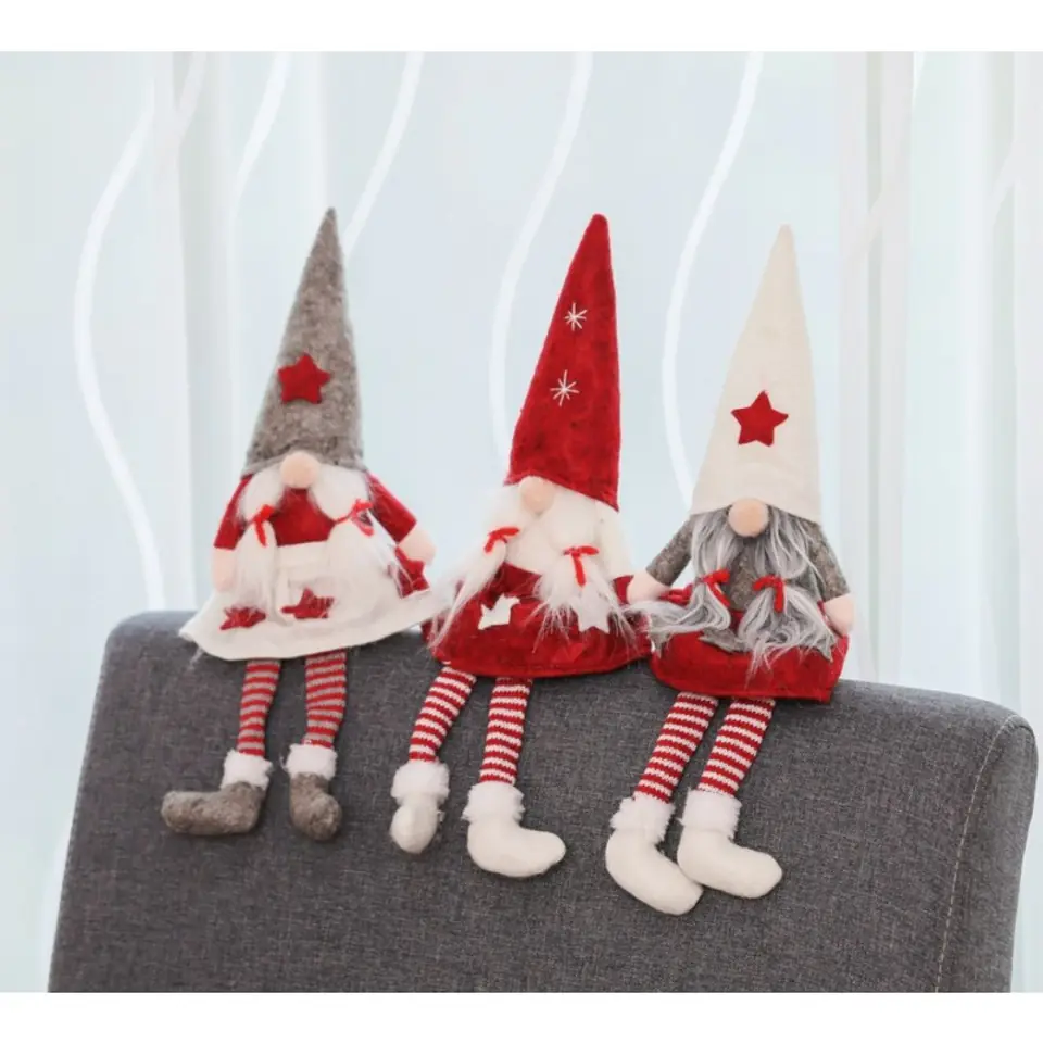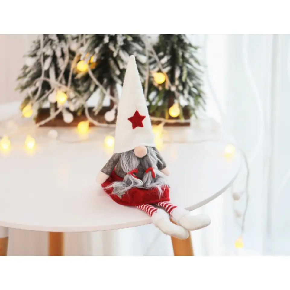 Świąteczny krasnal z wiszącymi nóżkamiWypełniony pluszemDla stabilizacji pozycji stojącej w tułowiu posiadają piasek - co dodatkowo je obciąża Waga: 90 g Wymiary:Wysokość maksymalna : 32 cm Szerokość: 15 cm