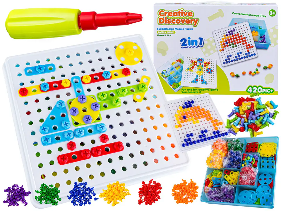 Zestaw do mozaiki pozwala tworzyć i kreować obrazki płaskie.Przykręcanie kolorowych śrubek wymaga precyzji ruchów ręki - zabawka usprawni zdolności manualne. Poszczególne elementy można wykorzystać do nauki kolorów. Wszystko znajduje się w wygodnym i praktycznym opakowaniu z przegródkami oraz zamknięciem. To pozwala utrzymać ład i porządek po zakończonej zabawie.