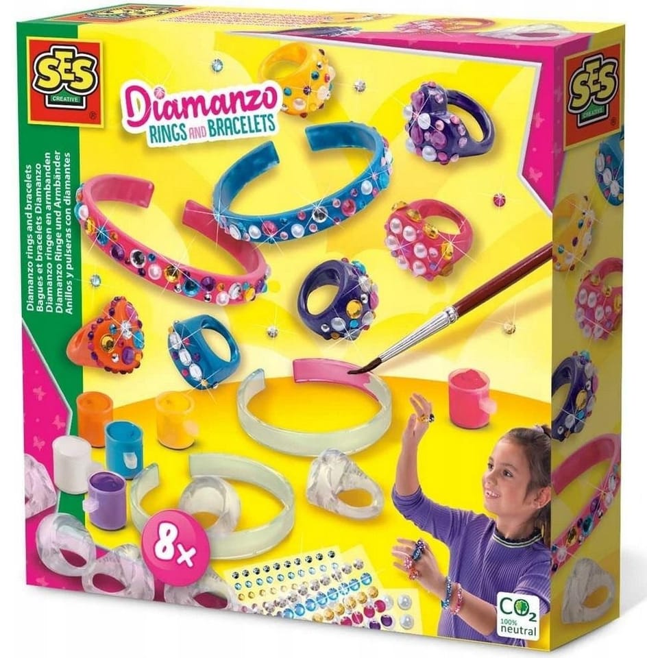Udekoruj własne bransoletki i pierścionki. Stwórz dwie fantastyczne bransoletki i sześć modnych pierścionków. Pomaluj swój własny wzór na przezroczystych bransoletkach i pierścionkach. Dla dziewczynek kochających modę. Pobudza kreatywność.