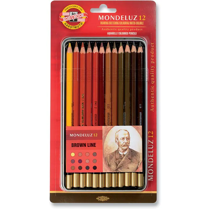 - Zestaw zawiera 12 odcieni kredek brązowych spakowanych w metalową kasetke.