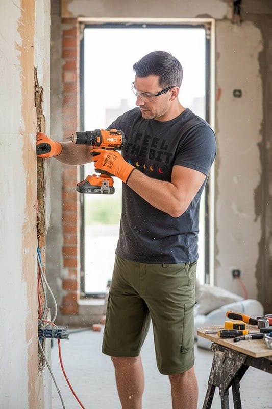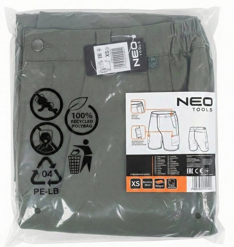 Spodenki NEO TOOLS posiadają wszywkę imienną oraz zgodność z certyfikatem CE.