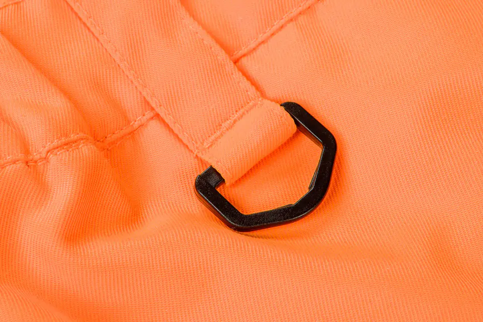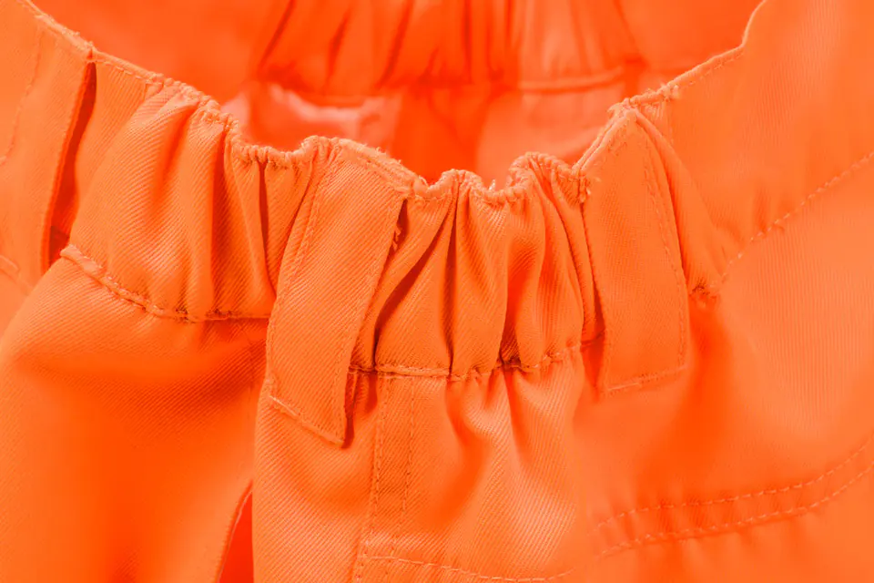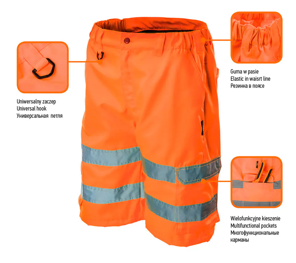Krótkie spodenki ostrzegawcze, pomarańczowe,rozmiar S, o intensywnej widzialności, klasa 1 wg normy EN ISO 20471, 80% poliester, 20% bawełna, gramatura 245 g/m2, wielofunkcyjne kieszenie, zaczep uniwersalny, gumka w pasie, certyfikat CE, EN ISO 13688:2013