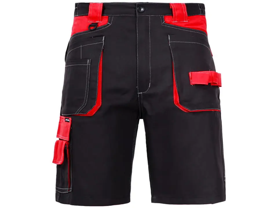 Spodenki robocze krótkie w kolorze czerwono czarnym wykonano ze 100% bawełny o gramaturze 245g/m2. Bardzo lekkie i przewiewne idealnie nadają się się do pracy w upalne i gorące dni. Spodenki posiadają sześć kieszeni w tym trzy zapinane na rzep, oczko na klucze oraz dodatkowo kieszeń na telefon komórkowy. Regulacja szerokości w pasie za pomocą gumki oraz wszywka identyfikacyjna. Mocne podwójne szwy. Spodenki posiadają certyfikat CE oraz normę EN ISO 13688. Są w pierwszej kategorii środków ochrony indywidualnej.