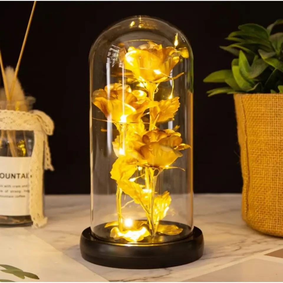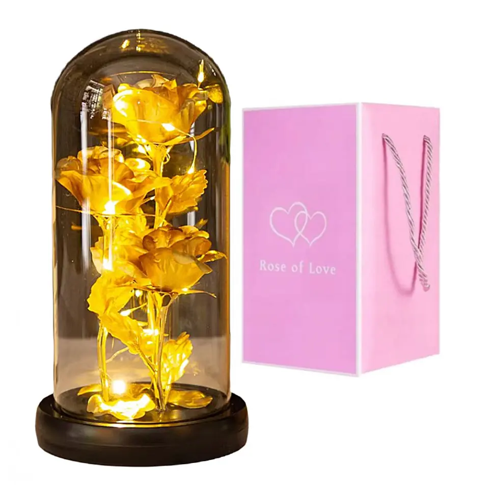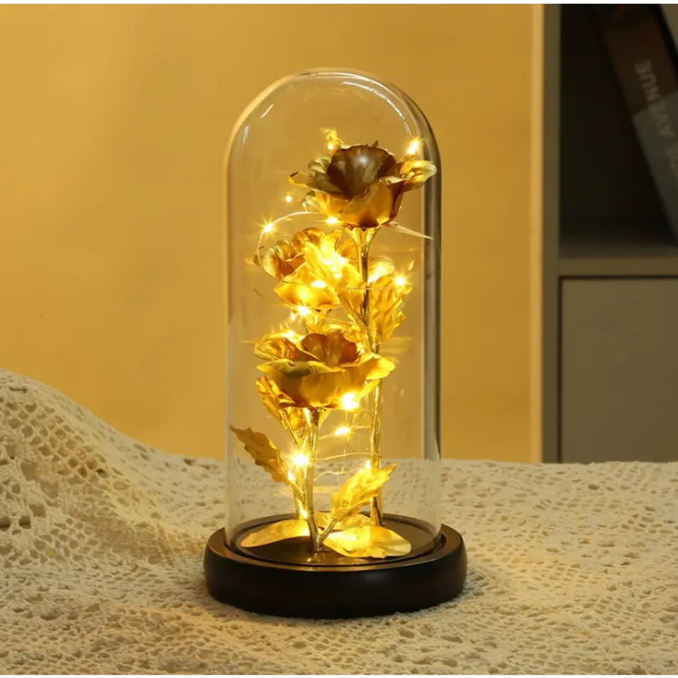 Kryształowa wieczna róża pod szklaną kopułą Subtelny i wyjątkowy prezent dla kobiety, idealny na wiele okazji. Specyfikacja:- Wytrzymała, transparentna kopuła,- Podstawa z tworzywa sztucznego,- Wewnątrz światełka LED, zasilane na 3 baterie 1,5V AAA (brak baterii w zestawie)>- Możliwość włączania i wyłączania lampek.Materiał: tworzywo sztuczne. Wymiary:Wysokość około 21 cmŚrednica postawy: 11 cm Produkt zapakowany w prezentowe pudełko oraz zabezpieczone wewnątrz styropianem. Wymiary pudełka: 13,2 x 24,7 x 13,2 cmWaga produktu z pudełkiem: 395 g