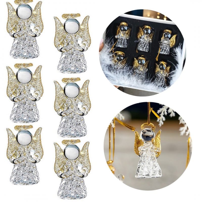 Zestaw ozdób świątecznych- AniołkiZestaw 6 mini ozdób choinkowych Przezroczysty szklany materiał jest elegancki i ponadczasowy Wymiary 1sztuki aniołka:Wysokość: 4,7 cmSzerokość: 2,1 cmWaga 1sztuki aniołka: 15g Wymiary opakowania:15cm x 13cm x 4cmWaga opakowania:115g Poczuj świąteczny klimat! Dodaj swojemu wnętrzu odrobinę zimowej magii. Aniołki nadają się jako ozdoba świąteczna do powieszenia na oknie, choince lub jako prezent, a nawet do dekoracji stroików!