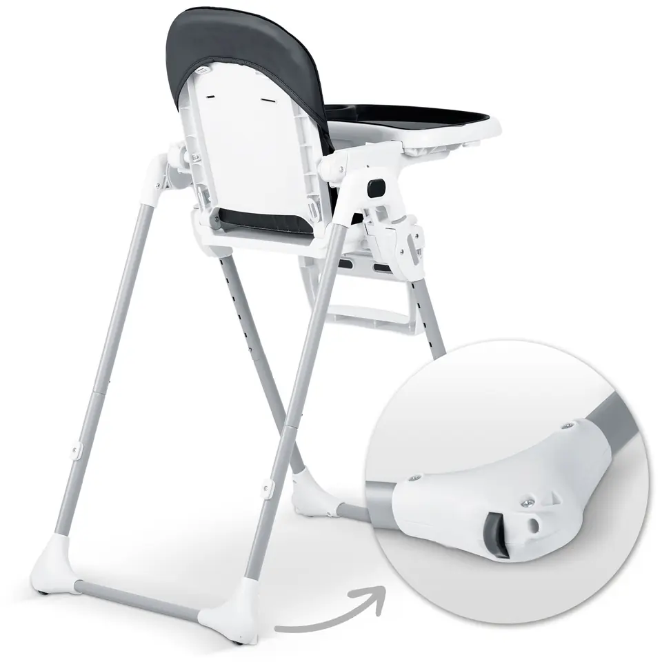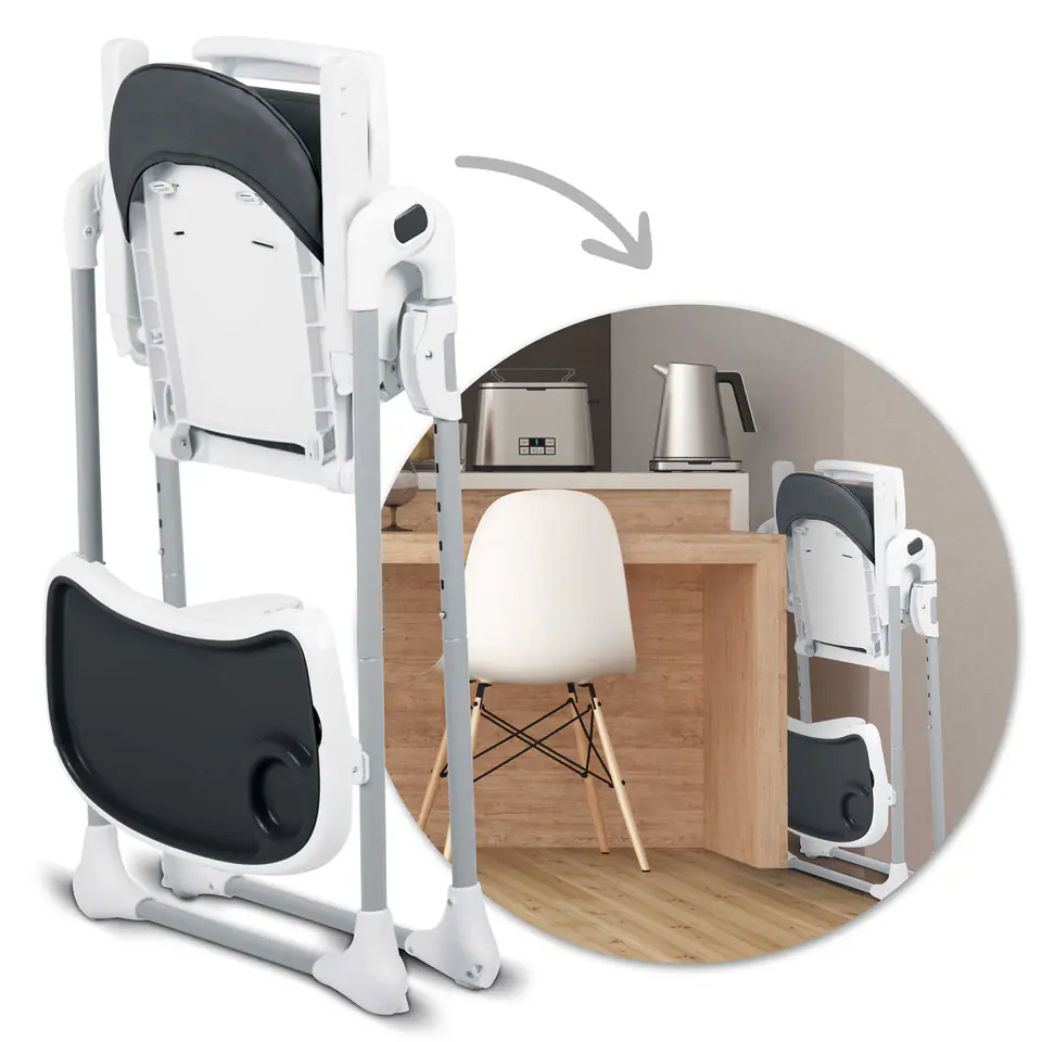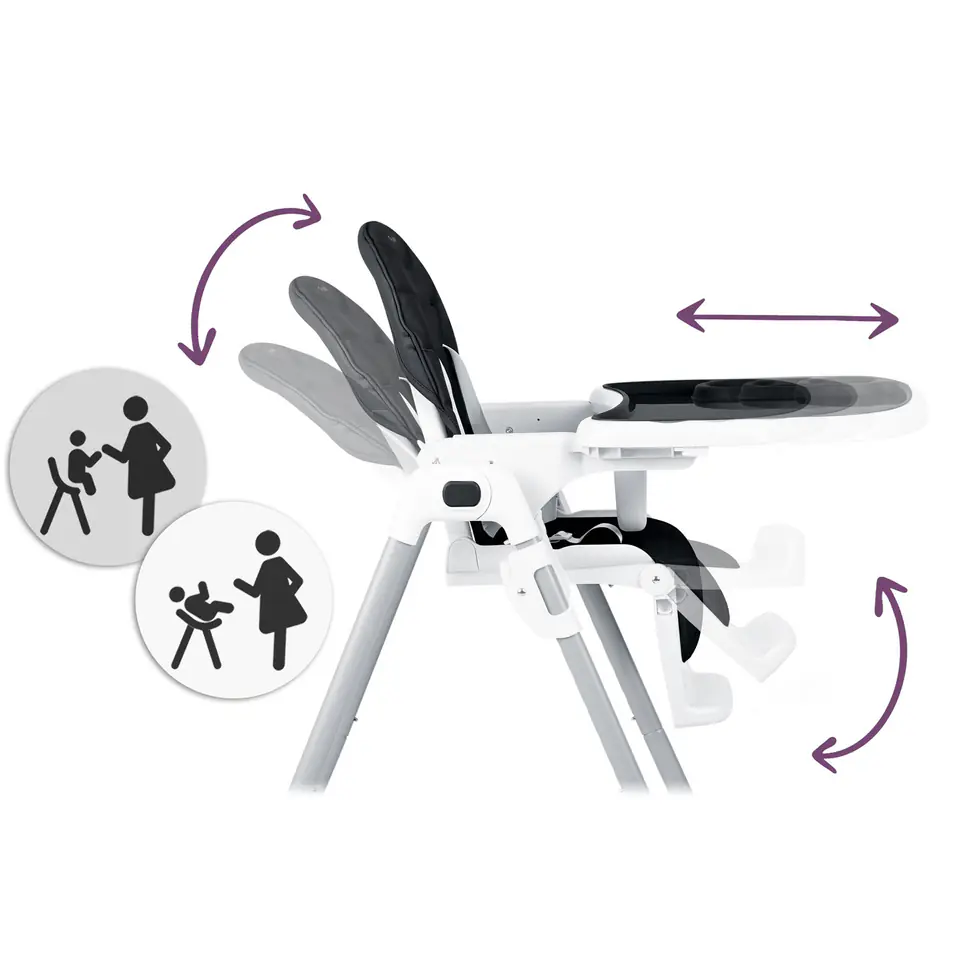 Krzesełko daje możliwość swobodnego regulowania odległości tacki od dziecka. Można je także w każdej chwili całkowicie zdemontować.