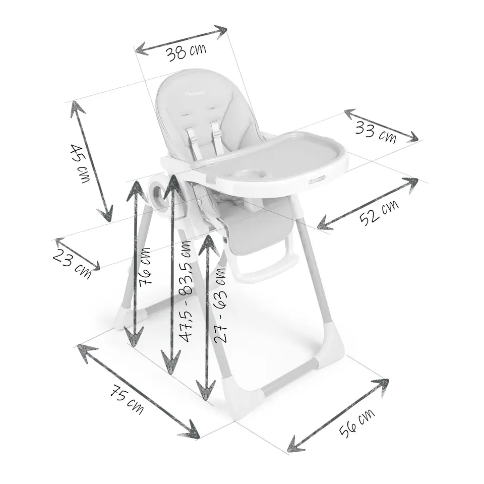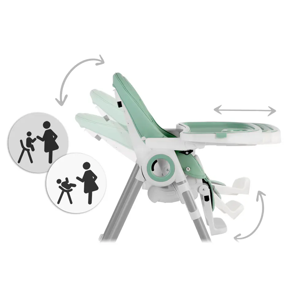 - możesz regulować położenie tacki lub ją zdemontować, gdy chcesz wyciągnąć dziecko z krzesełka lub przystawić je do stołu przy rodzinnym obiedzie.