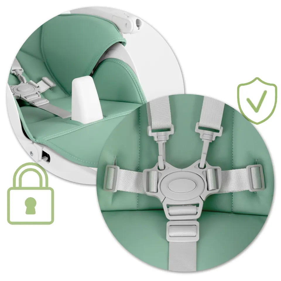 - Dodatkowe zabezpieczenie, które nie pozwoli na samoistne wysunięcie się dziecka z krzesełka. Można je całkowicie zdemontować gdy nie będzie ono już potrzebne.