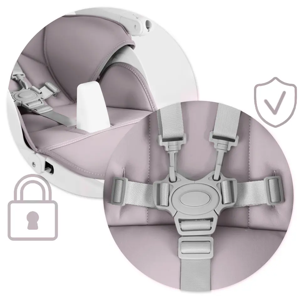 - dodatkowe zabezpieczenie, które nie pozwoli na samoistne wysunięcie się dziecka z krzesełka. Można je całkowicie zdemontować gdy nie będzie ono już potrzebne.