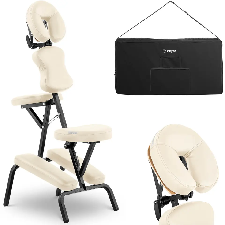 Kod producenta: 10040440Krzesło marki Physa sprawdzi się w salonie masażu, kosmetycznym czy tatuażu. Przeznaczone zostało do leczenia bolących pleców lub szyi. Konstrukcję krzesła wykonano z solidnej stali o nośności do 130 kg. Przemyślana konstrukcja gwarantuje równomierne rozłożenie ciężaru i stabilność podczas użytkowania. Podłokietnik pomaga przyjąć zrelaksowaną i wygodną pozycję. Tapicerowane powierzchnie zapewniają komfort siedzenia. Wysokość zagłówka jest regulowana w zakresie 1150 - 1350 mm oraz kąt nachylenia -90 - 45deg;. Klęcznik obity został PVC, jest łatwy w utrzymaniu czystości, odporny na olejki i wodę. Składana konstrukcja umożliwia łatwy transport. W komplecie znajduje się torba.Cechy produktu: