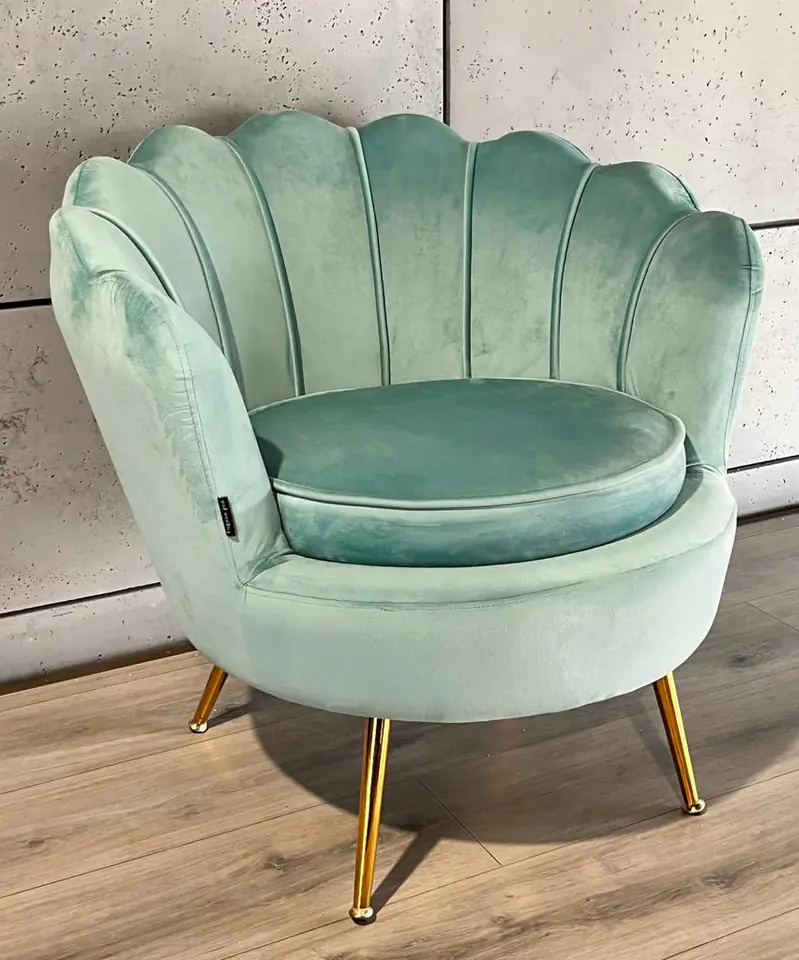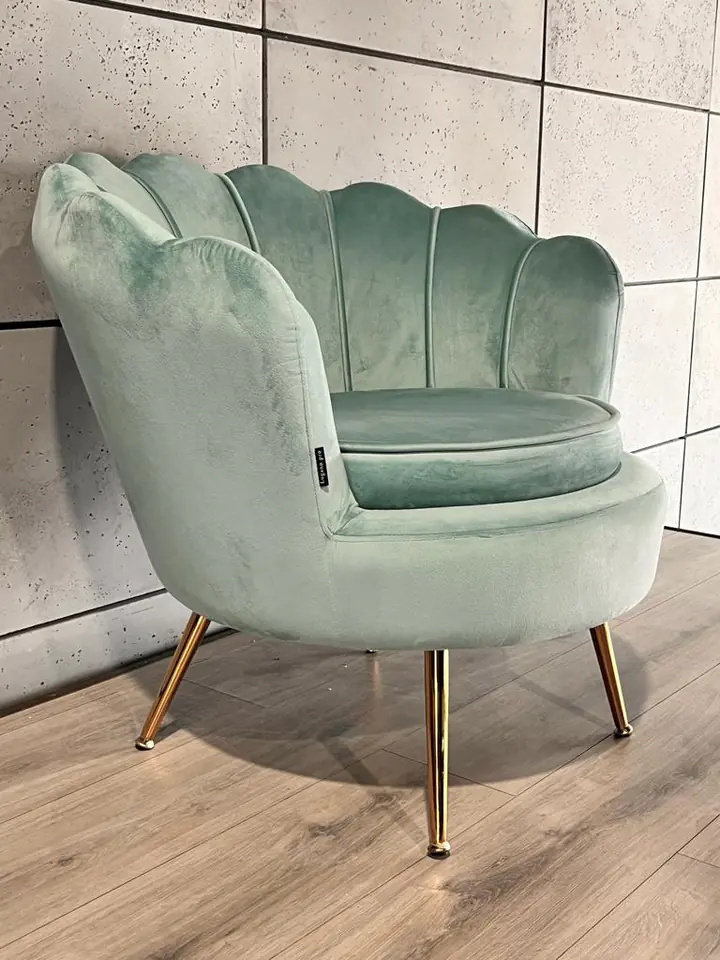 DONNA VELVET MINT - Fotel zwany Muszla - krzesło tapicerowane w kolorze miętowym, z unikatowym wzorem siedziska oraz oparcia i złotych nogach.