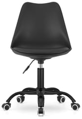 Nowoczesne krzesło obrotowe do biurka w kolorze czarnym, z miękką poduszką siedziska i czarną podstawą.