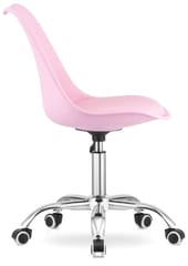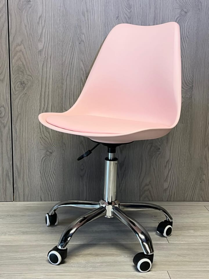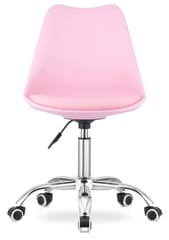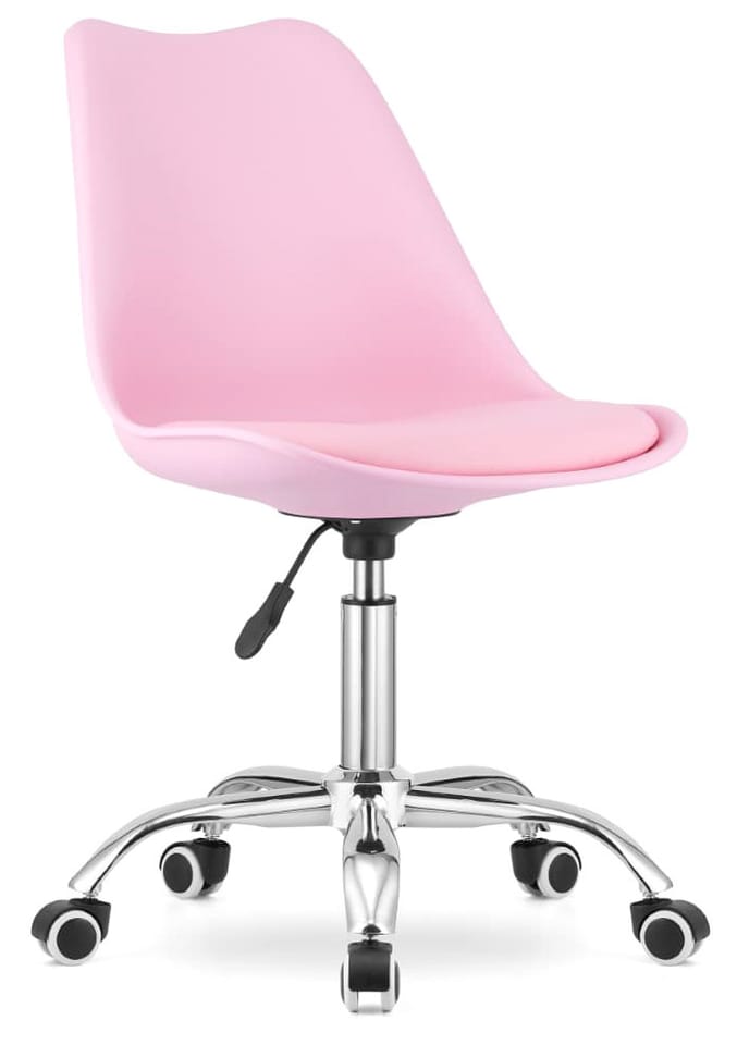 Nowoczesne krzesło obrotowe do biurka w kolorze różowy, z miękką poduszką siedziska i chromowaną podstawą.